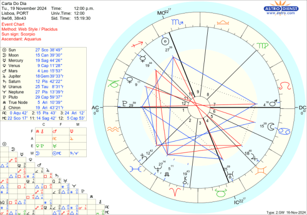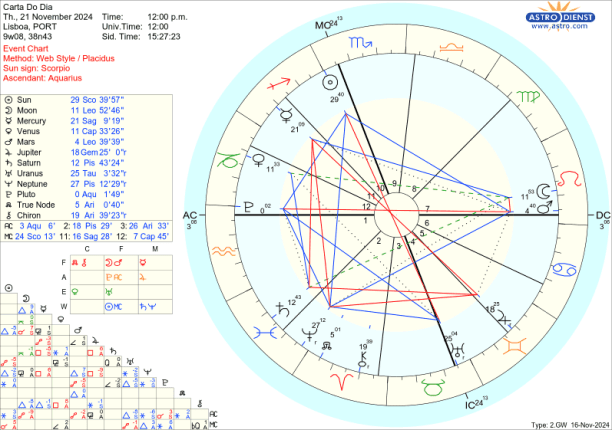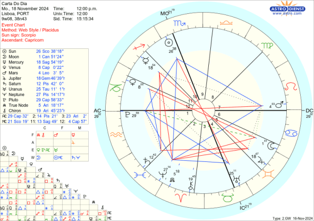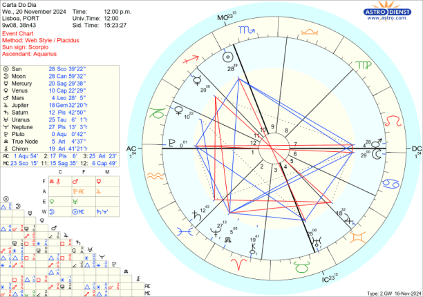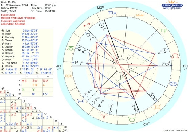 Segunda, terça e quarta feira a Lua está em Caranguejo e são as emoções, a casa, a familia, as rotinas ou, em termos colectivos, a tribo ou nação que são o foco das nossas emoções que requerem segurança face aos desenvolvimentos. Quarta feira, em particular, os aspectos são muito favoráveis porque a Lua, depois de fazer um trígono estabilizador a Saturno na terça, faz trígonos a Neptuno em Peixes e ao Sol em Escorpião antes de, na tarde de quarta, entrar em Leão, em oposição a Plutão e conjunta a Marte, trígono ao Nódulo Norte, como se convictos e apaziguados pudessemos assumir de forma afirmativa, um novo papel num novo ambiente – a exprimir com entusiasmo na quinta e sexta, graças ao trígono de Fogo entre a Lua em Leão e Mercúrio em Sagitário. Na sexta feira, o Sol sai de Escorpião para o Sagitário e dos sentimentos profundos e intensos do Escorpião passamos para outros horizontes, procuramos saberes e verdades e, com optimismo, revemos a informação que já temos à procura de sínteses – Júpiter regente do Sagitário está retrógrado em Gémeos- e para afinar conceitos, leis, projectos que queremos e podemos expôr com Mercúrio em recepção mútua com Júpiter. Ainda na sexta, há que, apesar do entusiasmo não deixar o ego ocupar demasiado espaço, mas tão pouco a quadratura da Lua a Urano e a Mercúrio o permite… Sábado e domingo, a Lua em Virgem- com o seu regente Mercúrio em Sagitário -é o garante de que estaremos atentos aos detalhes dos grandes planos.