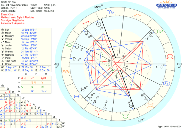 É nos ingressos dos planetas lentos nos signos, assim como no seu último grau – o chamado grau anarético – que as energias dos planetas são mais transtornantes. Daqui até 2026, Júpiter, Saturno, Urano, Neptuno, todos, fazem mais do que uma passagem seja pelo grau anarético seja pelo primeiro grau dos signos que estão a transitar, – respectivamente Gémeos/Caranguejo, Peixes/Carneiro, Touro/Gémeos, também Peixes/Carneiro ,- repisando crises de possibilidade e segurança, afinando arestas entre a ideologia e a acção, obrigando a abrir-nos a novos valores, revolucionando tudo, até que estejamos a viver outro paradigma de sociedade e de vida. Em causa, a partir desta semana em que, saído de Capricórnio, Plutão entra Aquário, está a nossa relação com a liberdade, a igualdade, a inteligência artificial , a descentralização financeira e as novas formas de controlo que se desenham também desde já com Saturno directo em Peixes.