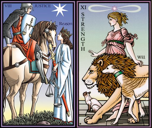 Vêm juntas as duas energias cuja numeração se inverte, de acordo com diferentes escolas do Tarot. Ambos são números de configuração simétrica, representando um diálogo dinâmico entre forças complementares: num caso a minha relação com as circunstâncias que me rodeiam, no outro a relação que estabeleço com o impulso animal que mora em mim.