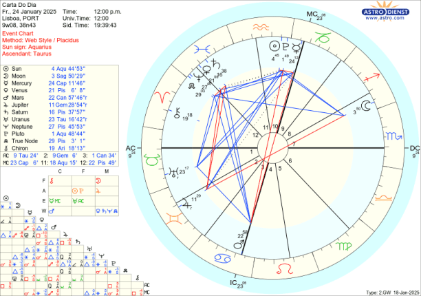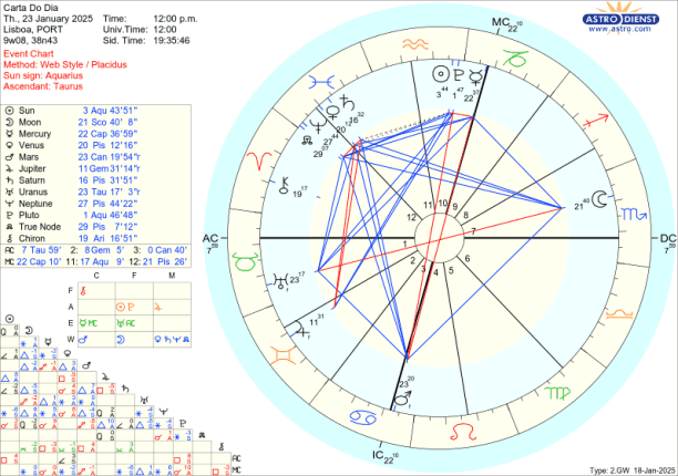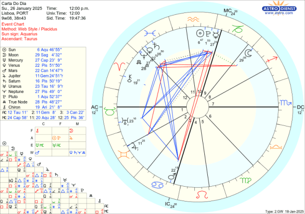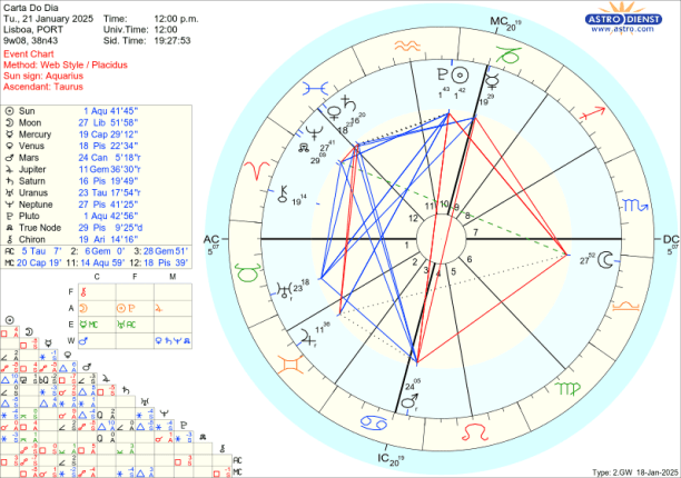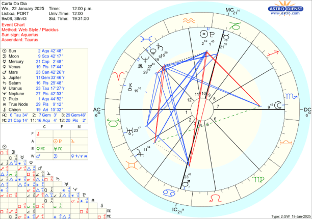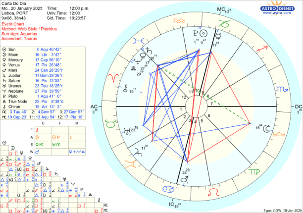 Quando se olha para os mapas da semana e são mais as linhas azuis- trígonos e sextis que saltam à vista, cansados de más notícias, a tendência é para rapidamente projectarmos perspectivas optimistas, que as coisas vão fluir e que oportunidades não faltarão. Mas não é bem assim. Quando começamos a olhar para as posições dos planetas, sabemos de onde vêm e para onde vão, continua a não ser fácil ter um olhar ligeiro sobre os tempos. Esta é uma semana de mudanças profundas na ordem social, política e financeira do mundo, o arranque de algo de novo resultado da conjunção do Sol a Plutão ao entrar em Aquário, coisa que não acontecia desde 1777/1778. Mais sobre isto AQUI. São mudanças de poder, mudanças de chefias, como nos eclipses podem “rolar cabeças” para outras ocuparem o seu lugar. É já na madrugada de segunda dia 20 que tal acontece e logo ao meio dia, em Washington , Trump toma posse como presidente dos EUA. Plutão rege as oligarquias, as altas finanças, mas também o poder das massas, as mafias, o terrorismo, enfim, todos aqueles actores e sectores capazes de provocar grandes reviravoltas nas vidas dos outros…Plutão também simboliza os grandes eventos da natureza como incêndios, erupções vulcânicas, tremores de terra e tudo que traga grandes desgraças. Trump ao poder com este aspecto, não engana. Como também não engana a quadratura ao Sol e a Plutão da Lua nos últimos graus de Balança e nos primeiros de Escorpião, tanto na segunda como na terça. A Lua rege o povo, o Sol simboliza quem governa e apesar dos eleitores que nele votaram, haverá certamente manifestações de protesto mais ainda porque Marte está em Caranguejo dentro da órbita de oposição a Mercúrio em Capricórnio e ao Sol e a Plutão em Aquário: descontentamento, contestação, conflito. Como Marte também simboliza na astrologia mundana os militares, o facto de estar retrógrado pode dizer-nos por exemplo que as questões militares estão todas em fase de re-avaliação, mesmo que os conflitos se continuem a desenrolar, os planos estão a ser revistos.