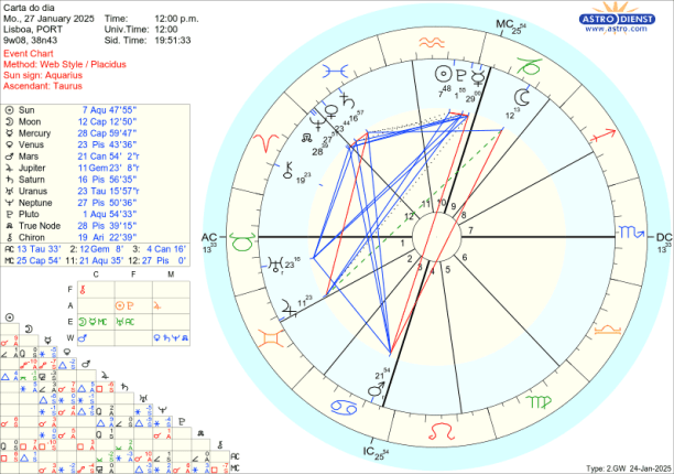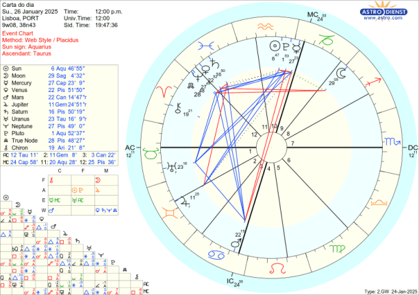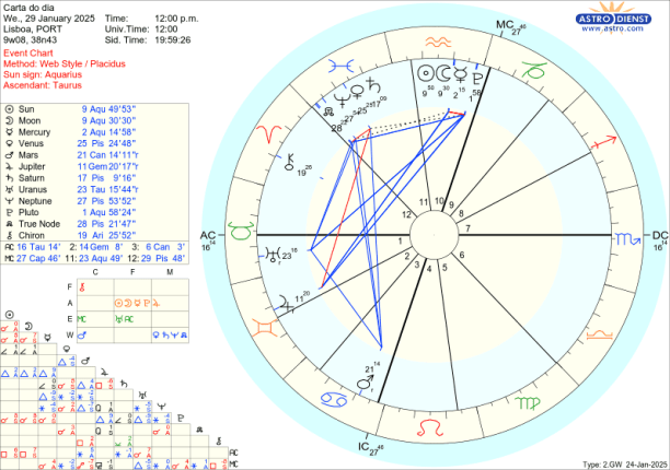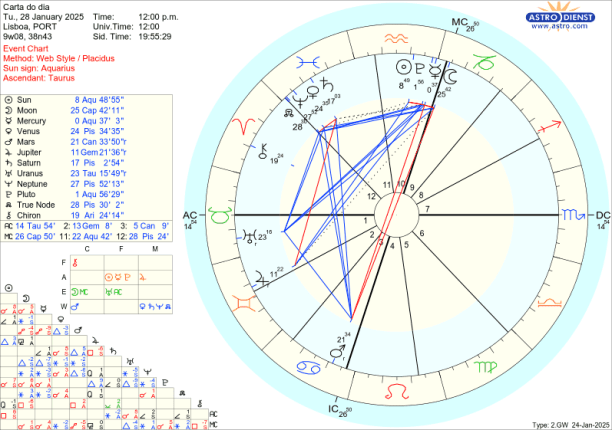 O mês de Janeiro acaba com uma Lua Nova em Aquário e lá vamos nós olhar para o mundo com um novo olhar, ao mesmo tempo que está aberta a discussão… É na quarta feira 29, no mesmo dia em que Mercúrio faz conjunção a Plutão logo no arranque de Aquário, o que de facto faz que estejam todos conjuntos, entre os 1 e os 9 graus de Aquário. Este primeiro decanato é regido por Saturno e Urano o que dá, a quem nele nasce, talentos múltiplos, imprevisibilidade e a determinação para ultrapassar todos os obstáculos, mesmo que demore tempo. Podemos por isso esperar que das sementes desta Lua Nova saia algo inovador, um qualquer plano de grande impacto que afectará muita gente quando vier a ser posto em prática, apesar de polémicas… A conjunção de Mercúrio a Plutão e o trígono de Júpiter em Gémeos a todo o stelium de planetas em Aquário reforça a ideia do debate generalizado ao mesmo tempo que Saturno conjunto a Vénus em Peixes sextil a Urano em Touro nos fala de uma imposição de ideias, de uma generosidade restrita, tudo em nome de novos valores. Exemplos possíveis podem ser limites de financiamento a acções humanitárias, restrições à migração, tarifas alfandegárias etc.. e já sabemos de que canto do mundo parte esta agenda…