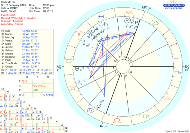 Enganam-nos por isso, novamente, ao primeiro olhar, os mapas da semana, cheios de fluidez nas linhas azuis, de trígonos e sextis e a esperança de uma Lua Nova. Há fluidez sim mas tudo decorre da determinação de pôr em prática planos duros que podem não agradar a toda a gente. Se tivermos de ser firmes e, sem hesitação, comandar grandes mudanças – pois é o bom momento. Se estivermos no campo dos que vão acatar com as novas regras então é melhor ser realista e aceitar que estes são os dados com que temos lidar. Fevereiro começa assim com a Lua em Peixes e em Carneiro, sábado e domingo 1 e 2, exacerbando sensibilidades e fragilidades ao mesmo tempo que vemos estimulada a capacidade de ir atrás de impulsos com Vénus em queda em Carneiro a partir de dia 4. Venus que deveria reger a diplomacia, a paz e harmonia -quando está em casa em Balança- , no Carneiro vai atrás do desejo, sem pensar nas consequências. Talvez avisados demos menos tiros no pé…