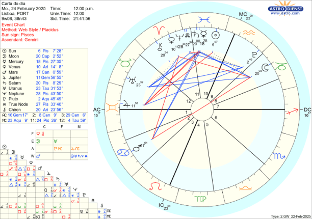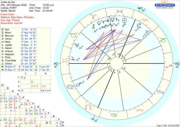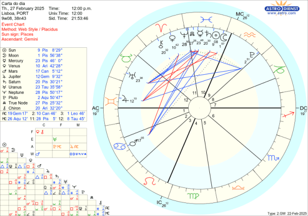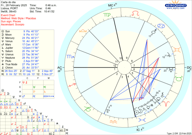 Fevereiro acaba com uma Lua Nova em Peixes, marco de muita emoção, ilusão, ideologia na base dos eclipses que vamos ter em Março. Assim, de segunda 24 a sexta 28, estamos já a viver sob a influência da muita Água nos Céus com Sol, Mercúrio, Saturno, Neptuno e o Nódulo Norte em Peixes, aos quais de junta a Lua no dia 28, no primeiro decanato do signo, regido por Júpiter/Neptuno. Mais ainda, Marte que está directo a partir de dia 25, em Caranguejo, outro signo de Água, é o agente de acção emocional, defensiva das seguranças familiares ou nacionais, pondo em prática, em sintonia, pelo trígono que faz a todos esses planetas em Peixes, a doutrina que Saturno estiver a formatar… Saturno e Urano são os regentes de Aquário onde está Plutão o que explica que todas as mudanças em curso no mundo tenham um altissimo fundamento ideológico e representem uma revolução de valores por o primeiro estar em Peixes e o segundo em Touro. Outro factor, tanto de discurso ideológico como de ilusão, é a conjunção de Mercúrio a Neptuno, num crescendo toda a semana, óptima apenas para a poesia e artes.