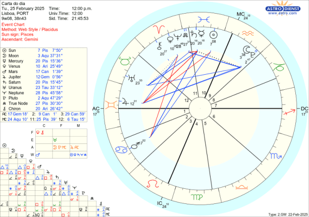 Terça feira dia 25 é um dia relevante porque não só Marte fica directo como Mercúrio faz conjunção exacta a Saturno em Peixes, num trígono largo a Marte, e a Lua faz conjunção a Plutão. Ou temos o poder ou sentimo-nos subjugados pelas circunstâncias. Trabalhar a distância emocional e a resiliência permite que a razão se sobreponha ao drama ou fantasias.