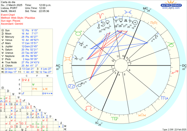 Júpiter que é o primeiro regente de Peixes está em trânsito em Gémeos, quadrado ao Sol toda a semana e quadrado à Lua Nova, todos em signos duais o que implica muita ambiguidade e incerteza para além de uma enorme divulgação dessas ambivalências o que não pode deixar ninguém descansado… Afinal como é que é, afinal como é que vai ser???- vamos interrogar-nos…. enquanto seguimos mais ou menos às cegas para os eclipses de 14 e 29 de Março, encruzilhadas de mudança..