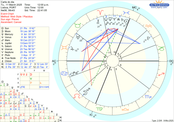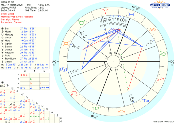 O eclipse ocorre sob um trígono de Urano à Lua e sextil ao Sol. Urano está em Touro e isto vai acelerar os confrontos de posição e forçar aberturas a mudanças de valores materiais e morais. Podemos tentar recordar 13 de Março de 1979 e 13 de Março de 1998 em que ocorreram eclipses da Lua exactamente no mesmo grau do que vai ter lugar agora a 14 de Março. Como foi? Em que casas do horóscopo temos os 23 graus de Peixes e Virgem? O que começou ou acabou nessa altura? O que ganhamos e/ou perdemos? Também os houve nesse eixo em 2015/17 mas não no mesmo grau.