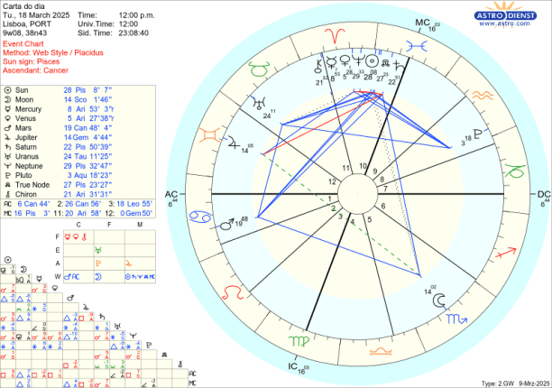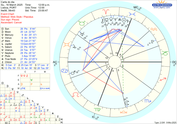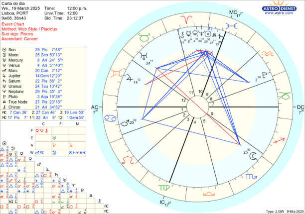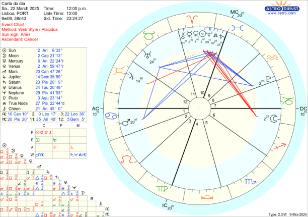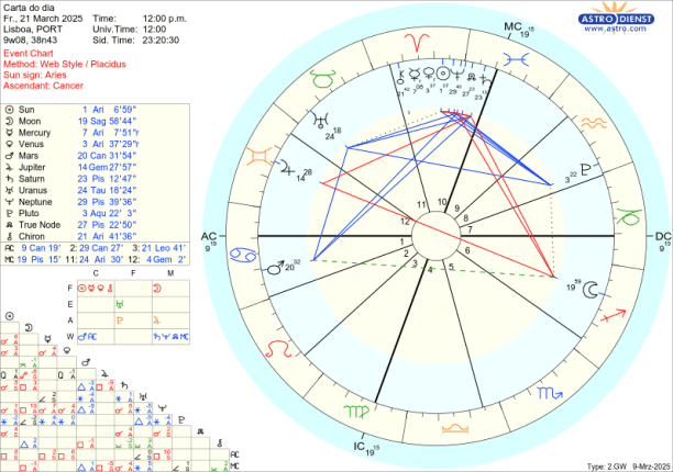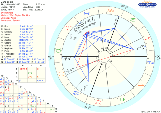 Dia 20 é o Equinócio. O Sol ingressa em Carneiro, signo de vontade, dinamismo, iniciativa, guerra… Marte, que o rege, continua no Caranguejo que, tal como Carneiro, é um signo cardinal onde a acção prima. Assim Marte manda no Equinócio, na Vénus e em Mercúrio retrógrados em Carneiro e também no Quíron que se encontra nesse mesmo signo. Como já foi dito, porque Marte está em Caranguejo, é a defesa da segurança emocional familiar, nacional que vai ser o motor de todas as acções, movimentos, escolhas…O trígono de Marte a Saturno em Peixes e o seu sextil a Urano em Touro faz com que as suas acções tenham contornos ideológicos e se traduzam em revoluções de valores.