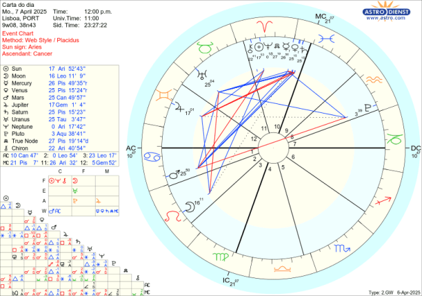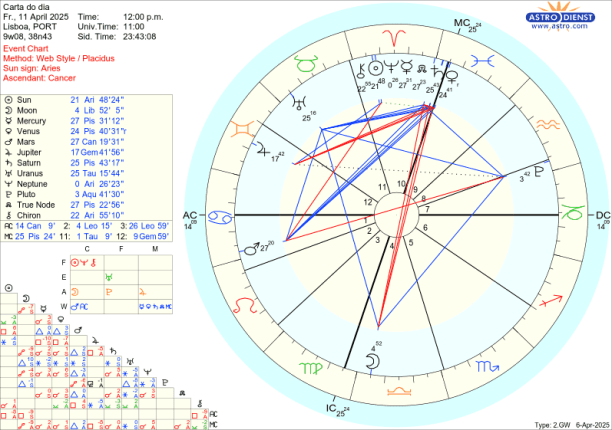 O trígono de Marte em Caranguejo a Vénus, Mercúrio e Saturno em Peixes e sextil a Urano é exacto na quarta feira dia em que Mercúrio entra directo e tudo poderia fluir melhor. No entanto, a Lua regente do Caranguejo está em Virgem, também regida por Mercúrio e o seu quadrado a Júpiter em queda em Gémeos também regido por Mercúrio em queda em Peixes não permite acertar contas nem ter ideia do quadro completo. Torna-se com este Mercúrio apesar de directo ter conversações conclusivas, pragmáticas, porque tudo é confuso, confessional, emocional, dirigido por Marte em Caranguejo.
