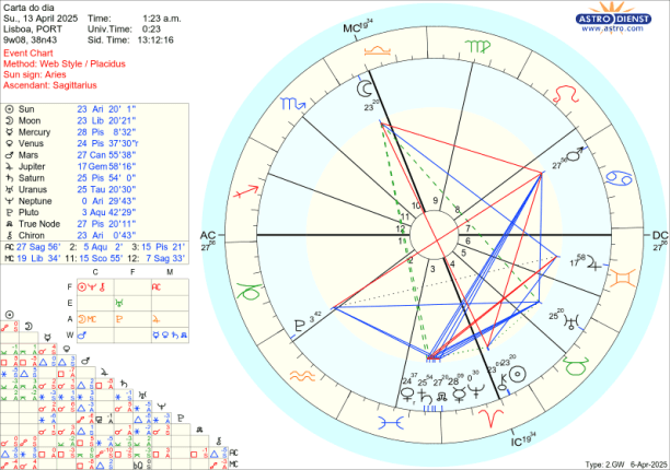 No domingo, a Lua em Balança, oposta ao Sol e a Quíron em Carneiro revela como a paz é incompatível com as vontades próprias insatisfeitas, a disparar em nome da segurança emocional- ou nacional – de que Marte regente do Carneiro, em trânsito em Caranguejo, abusa. Estamos a forçar as coisas a partir do coração da insegurança ou insatisfação. Recordemos em que investimos na Lua Nova em Carneiro de 29 de Março e façamos uma avaliação do que valeu ou não valeu. Depois é corrigir o possível até à próxima Lua Nova no dia 27 de Abril, ultrapassada a agitação da oposição de Marte a Plutão nos dias que a antecedem.