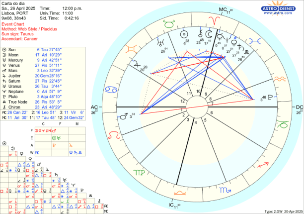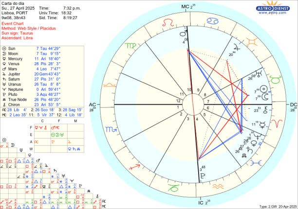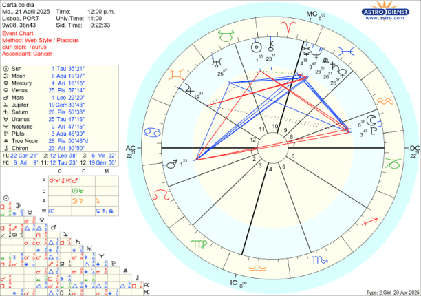 Estamos num Quarto Minguante, com a Lua conjunta a Plutão já na segunda feira, o que revela fracturas nos sistemas, nos grupos, nas políticas sociais, etc . É um momento de emoções de natureza Uraniana, repentina, explosiva, de contrariedade e reação. Será a crise de consciência derivada do eclipse do Sol na Lua Nova de 29 de Março em Carneiro em que percebemos o que tem mesmo de ser corrigido, face ao impacto dos desenvolvimentos desde esse eclipse. Este primeiro sinal da semana de que algo está bastante mal em termos colectivos é acompanhado também a 21, pelo Sol acabado de entrar em Touro em quadratura exacta a Marte- recém entrado em Leão – oposto à Lua, conjunta a Plutão em Aquário. Ou seja, se o Sol simboliza a nossa energia vital mas também chefes ou presidentes, a quadratura a Marte – que se desenvolve até à quadratura a Plutão na quarta feira – simboliza toda a contestação a que os valores/políticas económicos que esse Sol representa- por estar em Touro – estarão sujeitos, por tudo e por todos… É o choque entre a autoridade e o colectivo. Contestamos porque, em simultâneo Saturno está conjunto grau por grau ao Nódulo Norte, com Vénus também parte dessa conjunção em Peixes, toda a semana – e Vénus rege o Touro onde o Sol se encontra, – e temos de fazer face a restrições ou responsabilidades: económicas, emocionais, espirituais, administrativas, custos e benefícios de subvenções, seguros ou segurança social etc.. com perseverança e maturidade. É pesado… pode ser caro…
