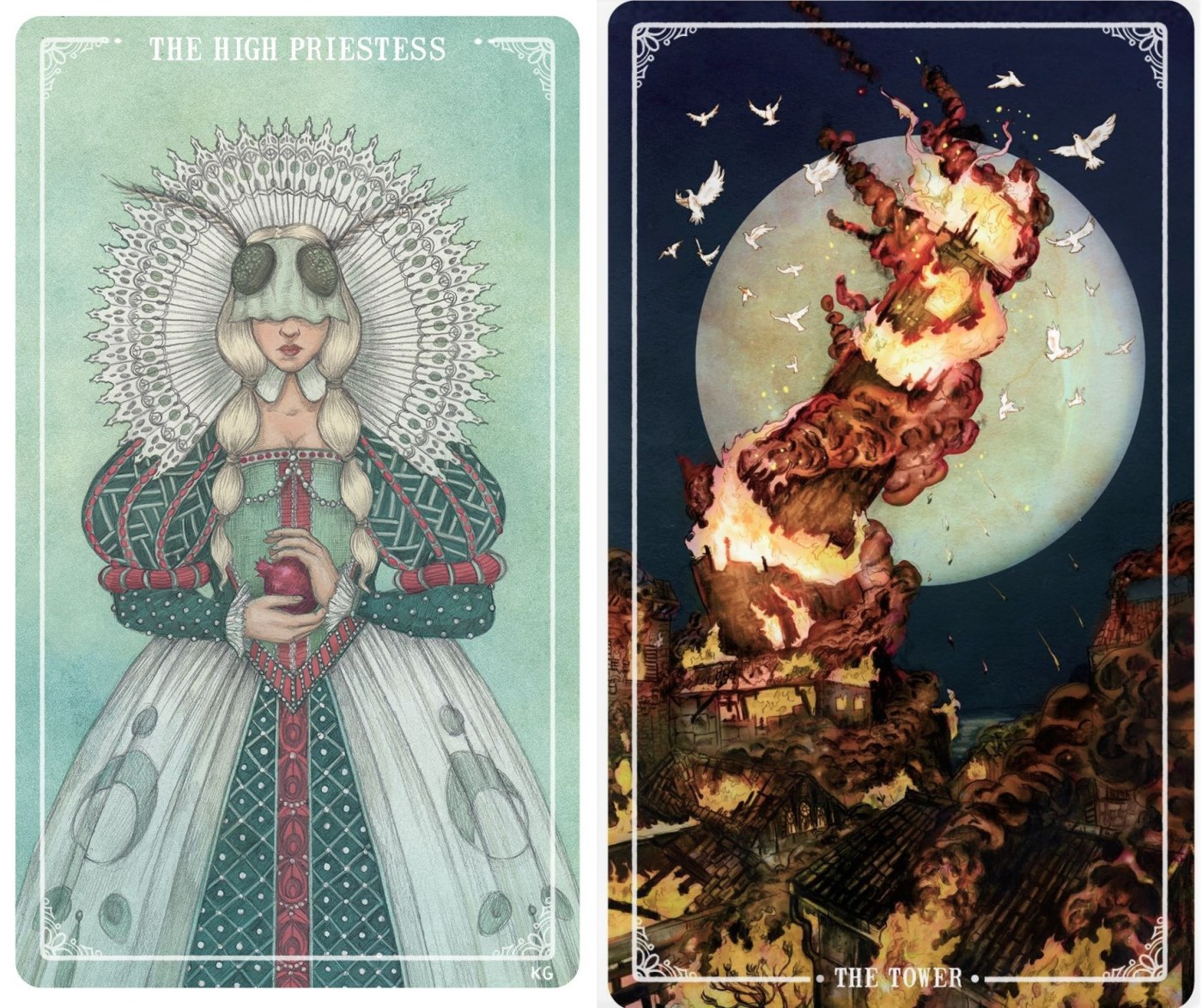 A Torre é Marte, a irromper aguerrido, sem dar tréguas nem ter contemplações. A Sacerdotisa é a Lua, com a sua luz suave, a iluminar para dentro. O que acontece com a Torre passa-se à nossa volta – a Sacerdotisa teremos de ser nós, cada um consigo. Teremos de deixar acontecer e meditar, a solução virá depois.