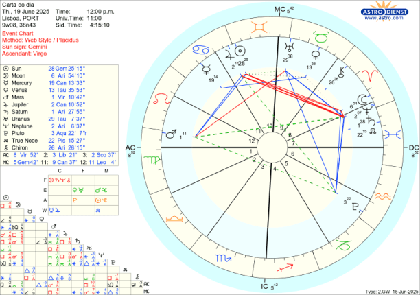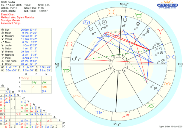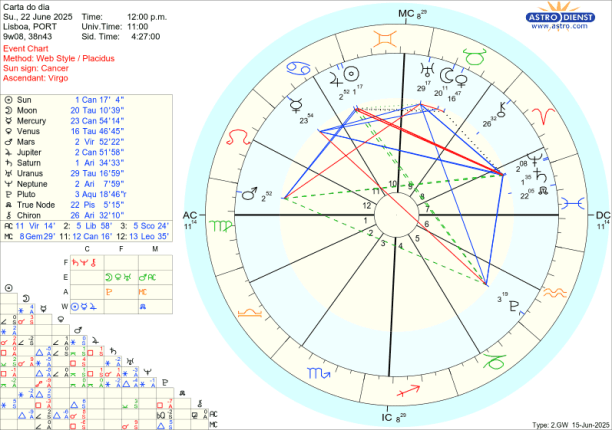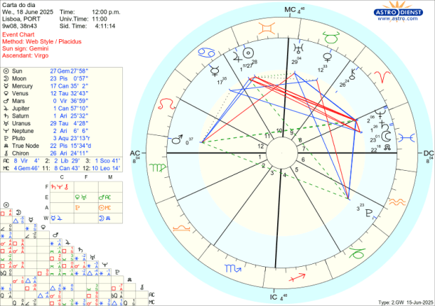 Marte entra em Virgem na terça 17 – passa o Ascendente de Trump e pode levá-lo a tomar decisões bélicas – mas em geral pede atitudes muito pragmáticas, calculadas, metódicas para a resolução dos problemas pessoais ou coletivos. O facto de estar em quadratura a Urano, mesmo fora de signo, até que Urano entre em Gémeos a 7 de Julho, diz-nos que haverá ainda maior estratégia, mais direção nos conflitos e maior impacto na área dos serviços que a todos afetará dado o quincúncio de Marte em Virgem a Saturno e Neptuno em Carneiro…