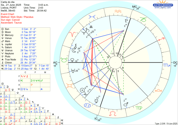 Desde a Lua Cheia de dia 11 até ontem domingo 15 que o mundo ficou ao rubro, em correspondência exacta com os difíceis trânsitos que os Céus apresentavam, em particular a quadratura de explosão social entre Jupiter e a conjunção Saturno/ Neptuno e a quadratura bélica entre Marte e Urano. Os dados estão assim lançados para uma prolongada crise que a todos engloba, dado que as quadraturas ocorrem no chamado Eixo Mundo dos signos cardinais, envolvendo Saturno e Neptuno em Carneiro e Júpiter em Caranguejo- signos de guerra e de protecção nacional. Quanto a Marte/Urano, os planetas do combate e da libertação estão agora em signos de Fogo e Terra, como e onde tudo se manifesta. No horizonte, vários são os aspectos complexos e de extensa repercussão já enunciados na semana passada, que nos prometem até ao próximo Verão de 2026, uma enorme turbulência social, política, bélica, global e uma re-organização de muitas partes do mundo . https://rositaiguana.com/2025/06/08/olhar-para-o-todo-por-partes/#more-30539