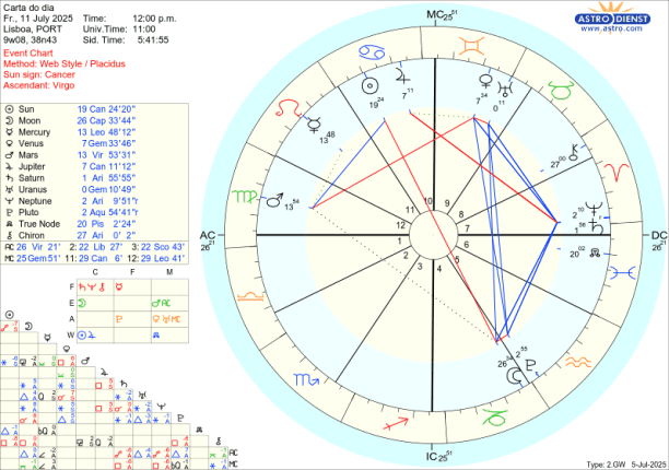A entrada de Urano, o planeta da revolução tecnológica e social e dos eventos inesperados, no signo de Gémeos é o primeiro sinal a ter em conta. Urano fica em Gémeos, sem passar do grau 1, até Setembro, mês em que fica retrogrado, voltando a Touro a 9 de Novembro, recuando até aos 27 graus de Touro até 6 de Fevereiro de 2026 quando volta a estar directo e retorna aos 0 graus de Gémeos – tal como esta semana – no dia 26 de Abril de 2026. Nesse Abril de 2026 também Neptuno estará – por causa da sua retrogradação até Dezembro – no mesmo grau que ocupa agora e Saturno que fica estacionário esta semana e retrógrado para a próxima também em Abril próximo estará de novo em Carneiro, em sextil a Plutão e conjunto desde Março 2026 a Neptuno. O padrão de trígono entre Urano e Plutão com Saturno e Neptuno em sextil a ambos – a que vamos assistir de forma quase exacta este Julho e Agosto, repete-se na Primavera de 2026. Marte que entra em Balança em Agosto, opondo-se a Saturno e a Neptuno, na Primavera do próximo ano estará a dar toda a força a conjunção Saturno Neptuno porque ingressa em Carneiro.