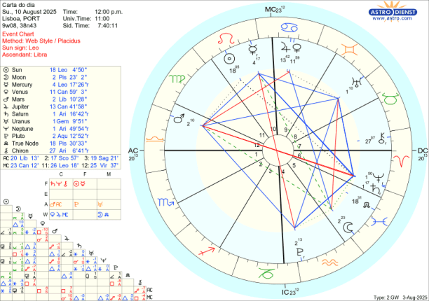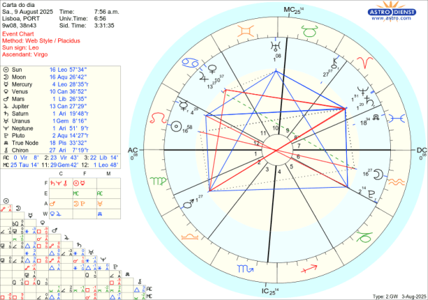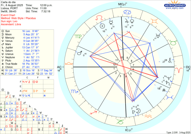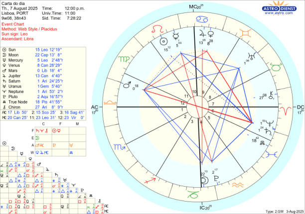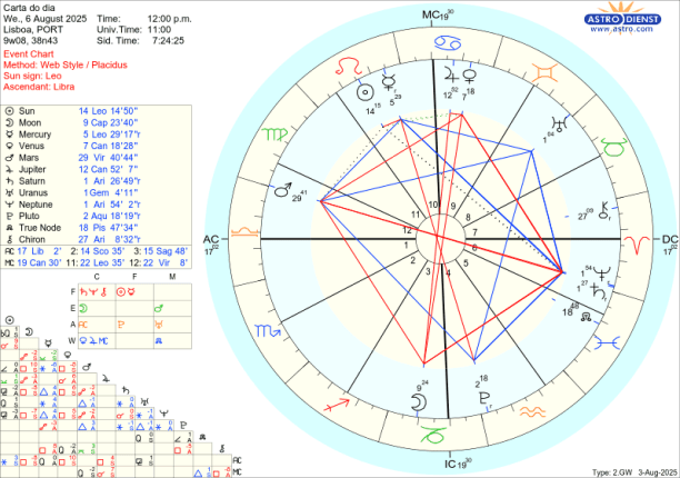 As dificuldade têm se ser resolvidas pelo diálogo e Mercúrio que já esteve conjunto ao Sol na semana passada mas ainda está retrógrado até dia 12 na próxima semana, dá, já desde segunda dia 4, sinais de que a explicar que temos de começar por dizer quem somos e o que nos move. Mercúrio está em Leão e toda a semana faz sextil a Marte e sextil a Urano, trígono a Saturno e Neptuno e em oposição a Plutão. Porque está retrógrado depois de cazimi, significa que já há consciência do que há que ser falado mas ainda estamos a tratar de questões pendentes que se revelaram dramáticas desde meados de Julho. Só na Lua Nova de dia 23 em Virgem que Mercúrio rege é que este sai da chamada zona sombra e chega ao grau 15 de Leão que foi o grau em que entrou retrógrado a 19 de Julho. Por isso, falar, dialogar, negociar é fundamental esta semana em paralelo com as tensões que vão surgindo e que podem não ser do nosso controlo, mas o diálogo é.
