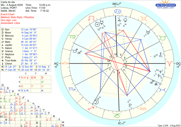 A tensão de “mando” nas relações ( Marte em Balança) devido à dificuldade de integrar as forças do ego com a resposta que a sociedade dá ( Sol em Leão oposto a Lua em Aquário) , integra-se ainda num quadro maior que é o dos trígonos de Marte a Plutão em Aquário e a Urano em Gémeos, sendo que estes dois fazem um trígono entre si que tem Saturno e Neptuno em Carneiro em sextil a ambos os planetas, e por isso opostos a Marte em Balança. Ar e Fogo são os elementos determinantes e as sabotagens, explosões ou guerras em casa ou no mundo podem por isso ser de grande impacto na comunicação, telecomunicações ou tudo o que alastre por via do Fogo e do Ar. É também o tempo de inovar nestas áreas se tem sido essa a construção que temos vindo a fazer de projectos tecnologicamente inovadores que mudem o mundo para melhor… mas há conflitos de qualquer maneira para resolver.
