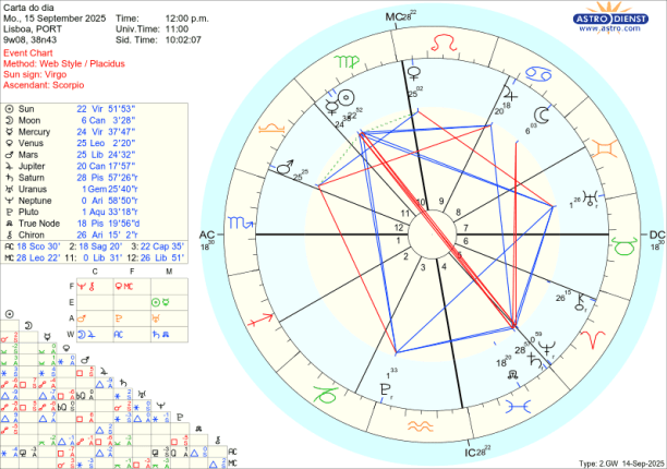 A caminho de se unir ao Sol no grau analítico de 29 graus de Virgem no domingo 21, a Lua está segunda e terça 15 e 16 no signo do Caranguejo a pedir atenção à casa, familia, nacionalismos, em particular e de forma mais exacerbada e conflituosa na terça porque faz conjunção a Júpiter e quadratura a Marte em Balança. O dramatismo é maior na quarta feira porque a Lua ao entrar em Leão faz oposição a Plutão em Aquário excitando o confronto entre sentido de identidade/ individualismo e as forças colectivas. Na quinta há mudanças energéticas importantes. Mercúrio entra em Balança o que significa que procuras falar de forma justa e equilibrada à procura de consensos mas Vénus que rege e Balança está em Virgem- estão como se diz em recepção mútua – e será nos detalhes que dividem e não nos diálogos unificadores que o foco vai estar. Mais ainda, céus de trovoadas ameaçam já ribombar por cima das boas tentativas porque Venus aproxima-se dos 0 graus de Virgem de onde fará quadratura a Urano em Gémeos – que pode ter impactos financeiros importantes e súbitos por volta de sexta 19, antes do eclipse e Marte aproxima-se também de uma bélica quadratura a Plutão ao entrar em Escorpião, para a semana, logo a seguir ao eclipse.