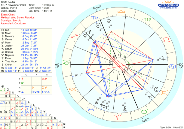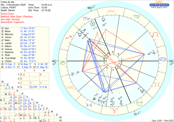 Mercúrio o planeta da comunicação, da lógica, das trocas e do movimento está em Sagitário, signo em que está em exílio – dado que rege o signo oposto dos Gémeos. Resultado, a conversa torna-se mais filosófica, menos pragmática, queremos discutir grandes ideias, grandes princípios mas o diálogo pode azedar ou tornar-se mais agressivo a partir de terça feira e toda a semana com o ingresso de Marte em Sagitário, onde fará conjunção a Mercúrio. É certo que, com Marte envolvido, o tom da conversa vai mudar e são os grandes investimentos no futuro ou os golpes a longo prazo ou distância que nos vão mover – e a Lua Cheia no dia 5 é já para mostrar quem de facto tem o poder e o que pode. O impacto será visível em casa ou no mundo devido ao sextil de Marte a Plutão em Aquário. A intensidade mantem-se semana fora sendo quinta dia 6 um dia particularmente irritante, surpreendente ou custar caro com a Lua em conjunção a Urano- que regressa a Touro- , oposta a Marte e a Mercúrio. Atenção às finanças ou a valores que pensávamos seguros e já não o são, por causas que não dominamos.