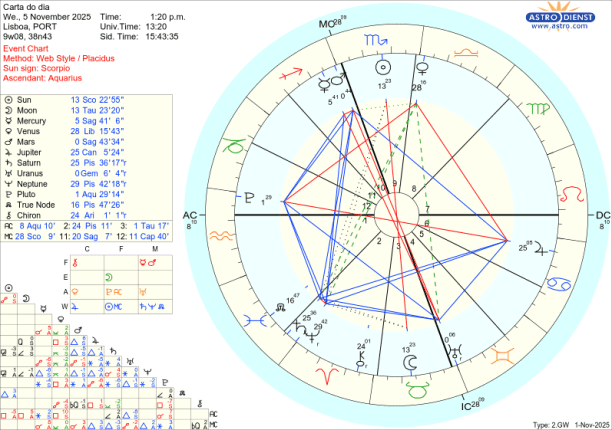 Quem tiver planetas ou ângulos entre os 9 e os 17 graus dos signos fixos- Touro- Leão-Escorpião- Aquário, vai esta semana sentir mais fortemente a Lua Cheia na quarta feira dia 5, a 13 graus do Touro. É o dia do culminar dos esforços desenvolvidos desde a Lua Nova de 21 de Outubro, a resposta às promessas que então foram feitas, a materialização dos investimentos em relações e acordos em que apostamos quando a Lua, nessa data, se juntou ao Sol no signo da Balança.