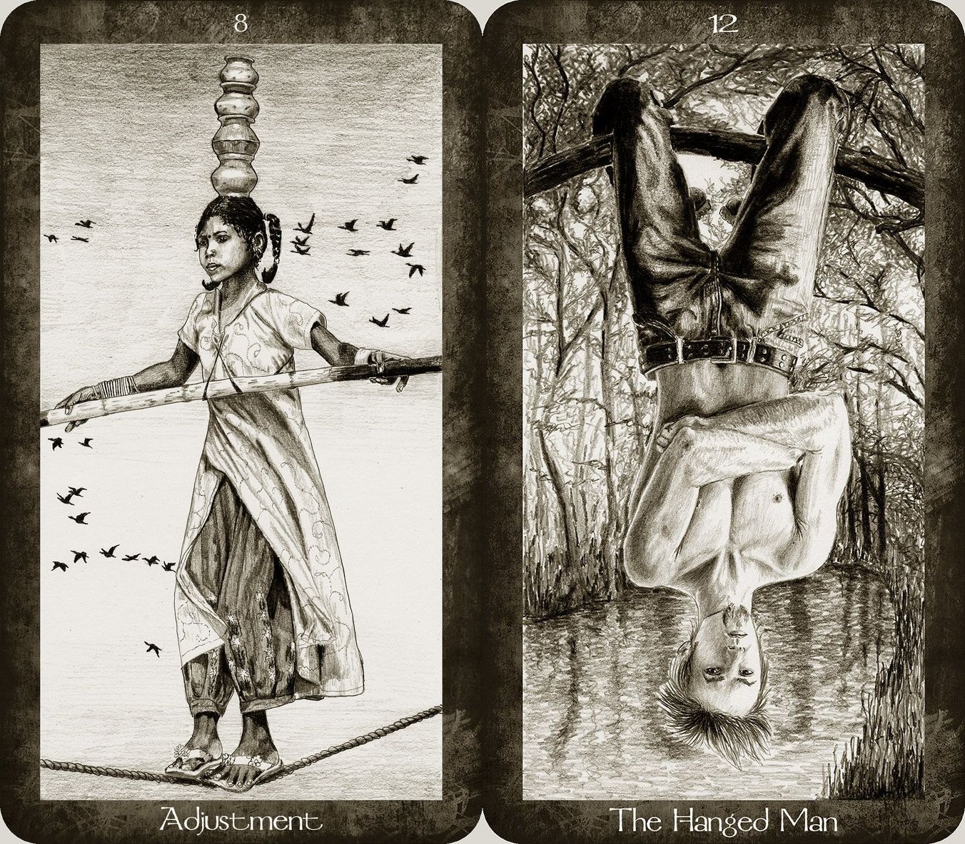 Comecemos pelo Arcano mais problemático: o Dependurado corresponde a momentos de possível mudança de rumo na nossa vida, mas em que precisamos de nos afastar para esperar e reflectir. É um tempo suspenso, em que teremos de conseguir ver as coisas por um ângulo novo e interiorizar essa visão, para depois sermos capazes de retomar a acção na direcção escolhida. Precisamos de transcender o ego e aceitar que não é tempo de intervir, enquanto a observação de fora, a capacidade de acompanhar o que se passa apenas olhando, mas numa perspectiva nova (estamos de pernas para o ar…), nos dá uma luz diferente para compreender e encontrar caminhos. Chamemos-lhe uma trégua desconfortável, entre momentos significativos que nos são traçados por forças de mudança.