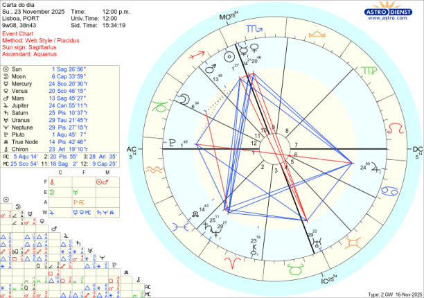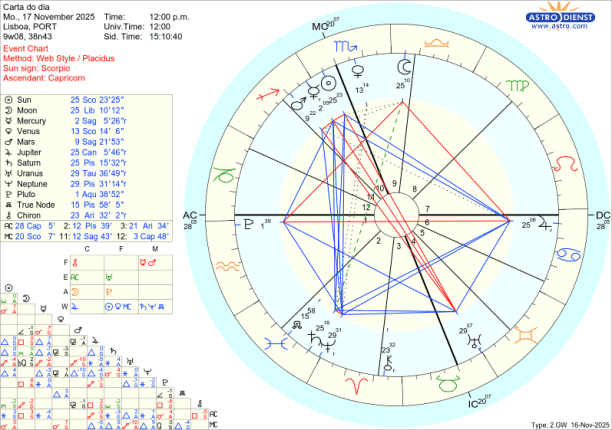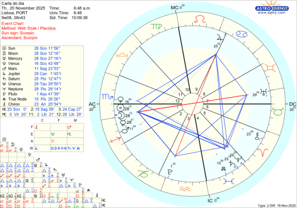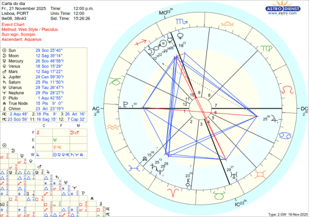 Há cinco planetas que estão retrógrados, quatro dos quais em signos de Água: Neptuno e Saturno em Peixes, Mercúrio em Escorpião e Júpiter em Caranguejo. Isto simboliza a revisão da filosofia, fé, ideologia a que há que dar nova forma, a revisão dos discursos e das lógicas de poder e das finanças, o repensar de como vamos expandir a nossa segurança doméstica, familiar ou nacional. Estas retrogradações pedem que cheguemos ao que é realmente exigido para se prosseguir. Neste quadro, uma Lua Nova em Escorpião implica, para além das revisões em curso, uma semente, um princípio, um arrancar de um processo novo que garanta aquilo que estamos a trabalhar para o futuro, que queremos controlar, que nos é essencial como pessoa ou como sociedade ou nação. A energia desta Lua nova flui em trígono a Saturno, Neptuno e Júpiter e faz conjunção a Mercúrio. É um passo no caminho que se pretende. Ora como o outro planeta que está retrógrado é Urano em Touro, são as questões territoriais ou materiais que vão fazer ” saltar as tampas” porque a Lua Nova é exactamente oposta ao planeta do imprevisto e do radical. Plutão em Aquario está sextil à Lua Nova e a Neptuno e oposto a Júpiter o que simboliza o potencial de impactos na organização do mundo ou dos grupos a que pertencemos. Curiosamente Marte, o primeiro regente de Escorpião está em Sagitário sem fazer aspecto algum aos restantes planetas como se o que se dissesse não valesse para nada ou como se as grandes defesas jurídicas ou de princípios não tivessem relevância para o desenrolar dos acontecimentos. Uma Lua Nova no terceiro decanato de Escorpião é regida pela Lua o que torna ainda mais emocional, defensivo ou vingativo o que daqui sair….
