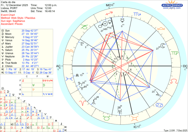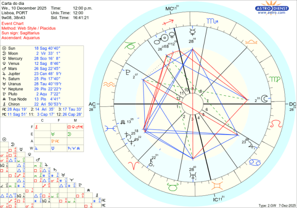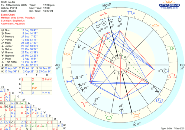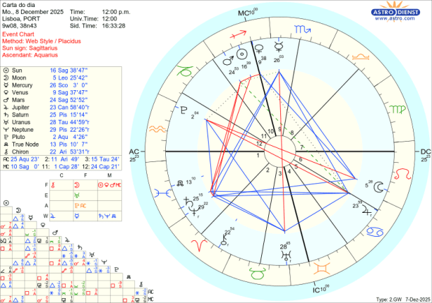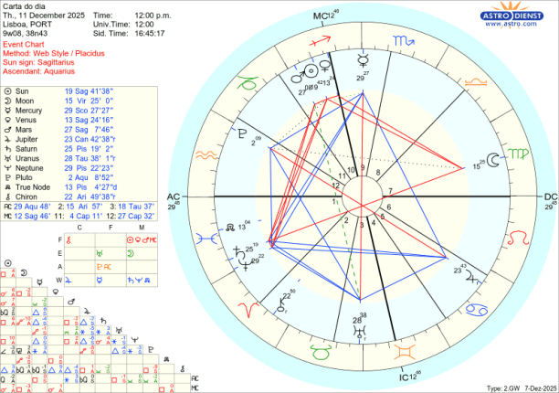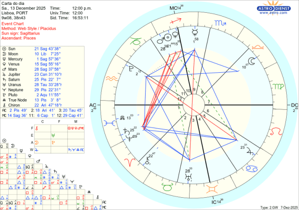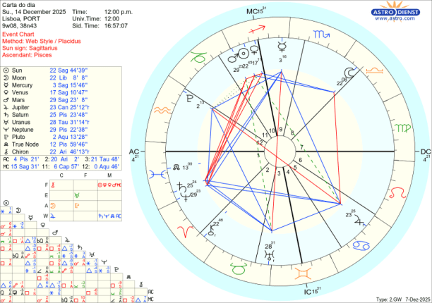 Frustração, impaciência, bloqueios e confusões são os temas da semana…. ou porque queremos fazer e nos impedem ou porque não temos as ideias claras ou porque querem que façamos mas resistimos ou porque não fazem como achamos que deve ser feito … enfim… todas as variantes possíveis do choque entre o que é a vontade e onde estão os limites e responsabilidades…. Será assim em casa e na política…. e só na Lua Nova de Sagitário no dia 20 é que veremos se o querer de agora tem possibilidades de ver o dia…