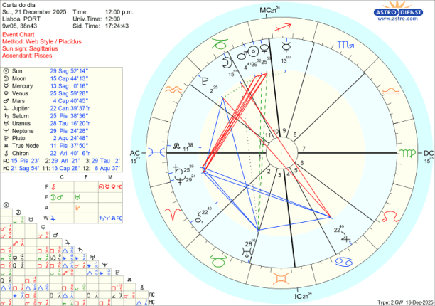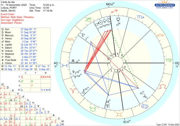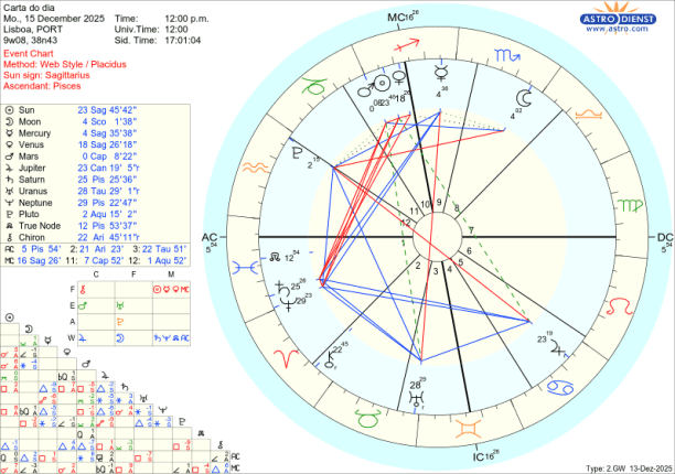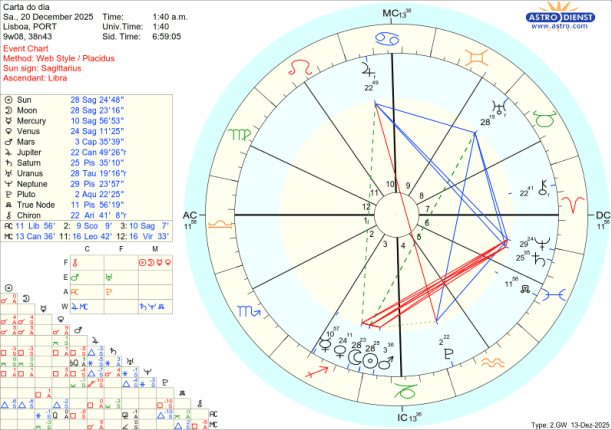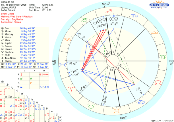 Vem sexta e a madrugada de sábado dia 20, certamente a noite mais escura e longa do ano. É noite de Lua Nova, na véspera do Solstício a partir do qual os dias vão começar, lentamente, a crescer e as noites a diminuir. Esta Lua Nova em Sagitário não podia ser mais tensa. É uma Lua que pede que, de corpo e coração, procuremos a verdade, o caminho, as leis que fazem sentido – porque assim o julgamos e porque assim o sentimos. Conjunta à Lua Nova, a pouco graus de distância, está Vénus que acrescenta todo o nosso empenho a esse posicionamento, com o qual pretendemos abrir o novo ciclo lunar e começar 2026. Mas há esquinas e muros que tudo dificultam pelas restrições ideológicas ou de fé, crença ou fantasia de Saturno em Peixes e simultaneamente o pouco realismo de Neptuno, também em Peixes, ambos em quadratura à Lua Nova e a Vénus. Júpiter em Caranguejo continua a ser a chave da tensão e, porque o seu aspecto de trígono a Saturno e Neptuno é mais fácil do que o quincúncio que faz à Lua Nova, tudo leva a crer que os limites se vão impor ao potencial de novos horizontes da Lua Nova. São as expectativas que não se realizam, verdades que não são práticas, sonhos que são só sonhos sem estrutura para subsistir. O dia pede cabeça fria e capacidade de encontrar terceiras vias.