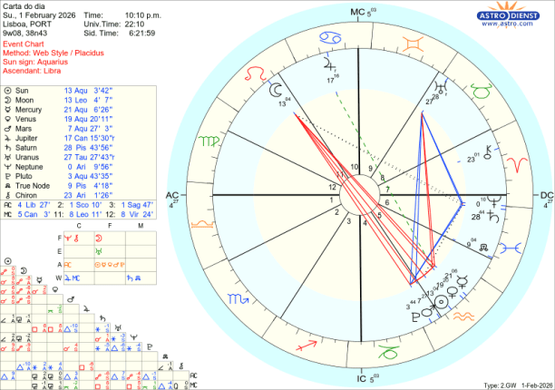Segue-se como datas relevantes em Fevereiro a conjunção exacta de Saturno e Neptuno em Carneiro dia 20, ciclo sempre marcante na história da Russia, e a quadratura sempre explosiva de Marte a Urano no dia 27. – temas a desenvolver nos próximos posts..