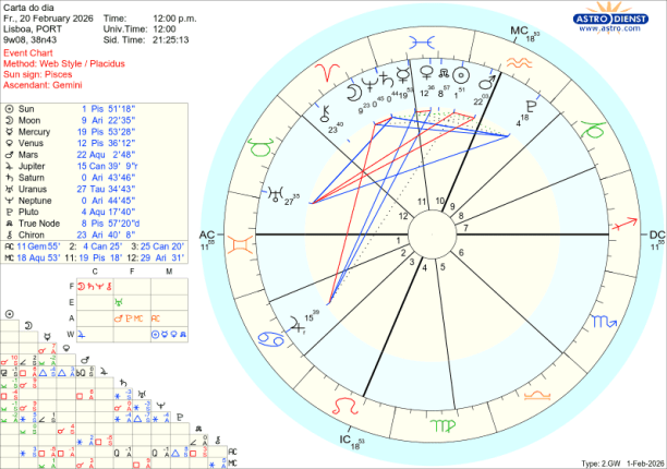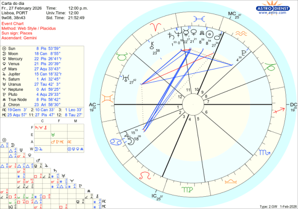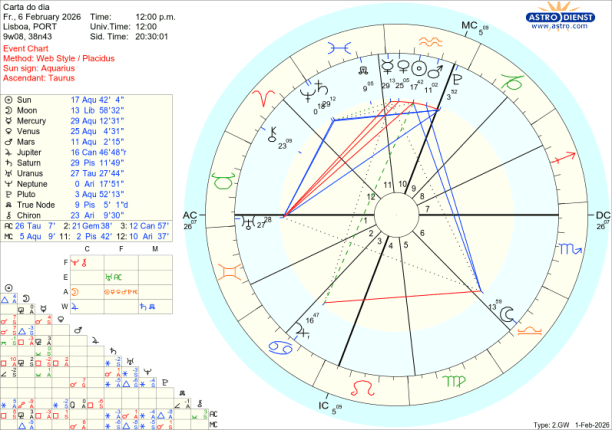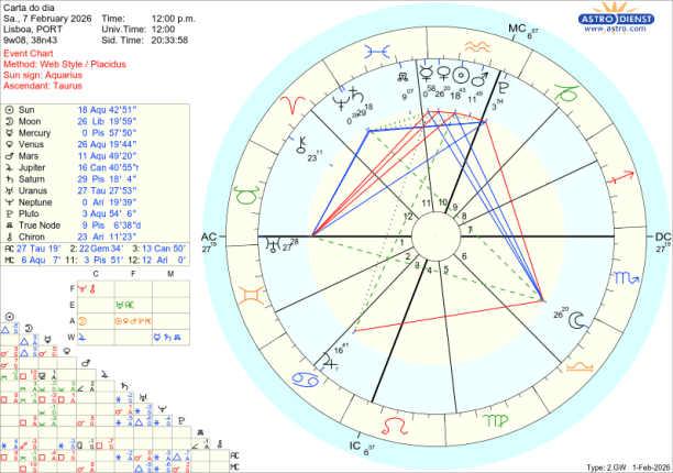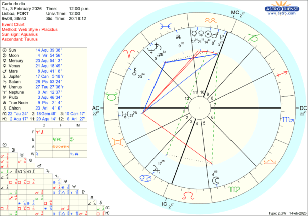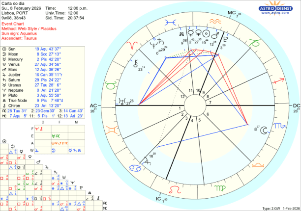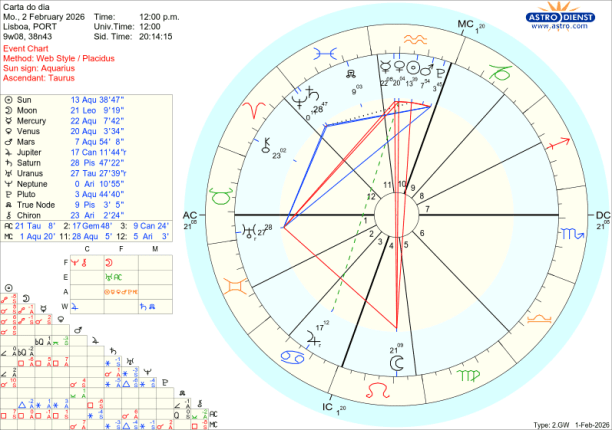 Ora, o que se passa neste mês de Fevereiro é que Mercúrio, Vénus, o Sol e Marte ao atravessarem o Aquário, – esse foco no que se passa em sociedade, – vão gradualmente, um a um, fazer quadratura ou seja estar em tensão, choque, com esse movimento de evolução de valores de todos os géneros, simbolizado pela pressão de Urano em Touro, no decanato de Saturno. O primeiro choque- discussão garantida, questões de liberdade de movimento e de expressão, notícias inesperadas, nervos à flor da pele, acontece logo no dia a seguir a Urano entrar directo, ou seja dia 5 de Fevereiro em que Mercúrio lhe faz quadratura. Ainda esta semana, dia 8, mas em órbita desde dia 6, é Vénus que faz quadratura a Urano: Vénus em Aquário representa, encoraja o investimento na Inteligência Artificial, nas criptomoedas, nas energias verdes mas a tensão a Urano em Touro pode indicar uma situação de bolha de mercado que rebenta ou traz dificuldades na valorização dessas áreas.
