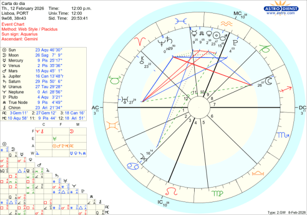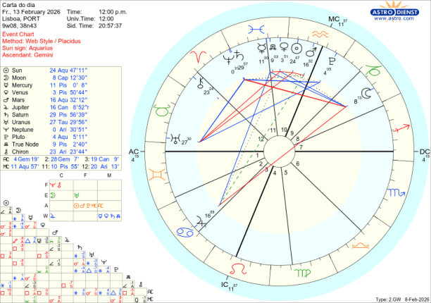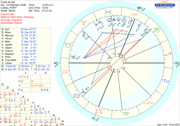 Mas de onde vem esta instabilidade? Os Céus falam claro. No signo do Aquário, que simboliza a sociedade, os grupos, o colectivo em que estamos inseridos, estão agora as forças profunda e brutalmente transformadoras de Plutão, a força de ataque de Marte, os olhos do mundo simbolizados pelo Sol e Vénus que representa as relações a todos os níveis. Depois do fim-de semana em que se faliu de paz mas se fez a guerra, em que os mercados desceram e subira em negociações se fizeram mas não chegaram a conclusões satisfatórias, Vénus está ainda nesta segunda feira em quadratura a Urano em Touro e daqui vem a tensão entre o que valorizamos de justiça ou paz em sociedade e para a sociedade e a necessidade de lá chegar encontrando outros valores que nos orientem. Nesta senda de choques à estabilidade, no próximo dia 17, será por trânsito que o Sol que se eclipsará e a Lua Nova que estão em quadratura a Urano abrindo caminho para a agressiva quadratura de Marte a Urano prevista nos últimos dias de Fevereiro…