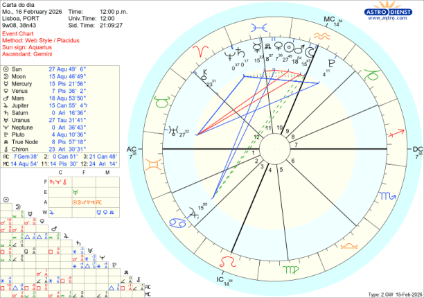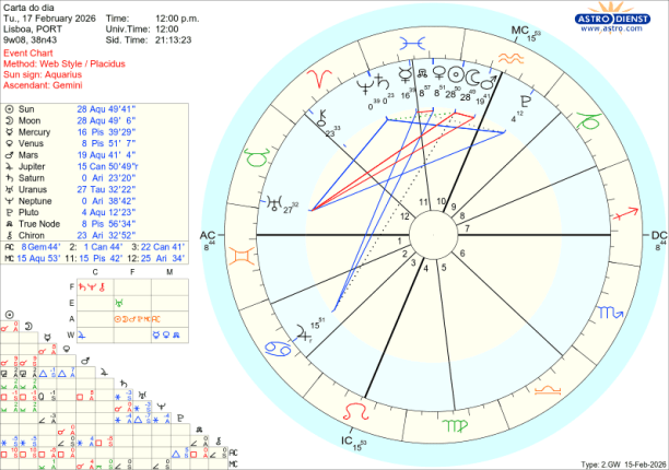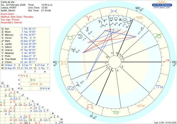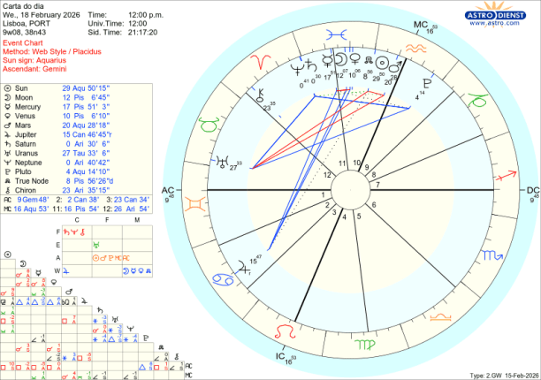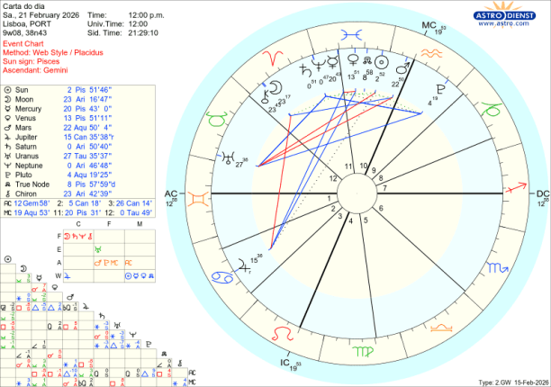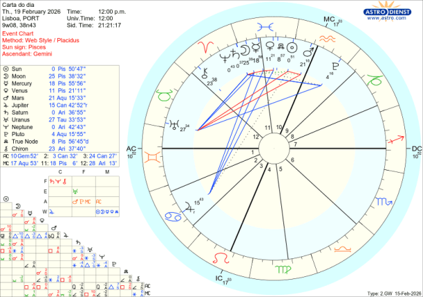 Como contraponto das tensões que os aspectos acima ilustram, a encorajar a compaixão, o amor universal, a união ou inclusão está Vénus em Peixes conjunta ao Nódulo Norte no dia do eclipse como que a dizer, cai um Rei Sol com a ocultação pela Lua e triunfa o Amor, num crescendo até ao trígono de Vénus a Júpiter em Caranguejo no domingo 22, com o Sol também já em Peixes desde quinta feira. É Peixes, tem a Lua, Marte, Saturno, o Sol e Vénus todos em Peixes, Bad Bunny, o cantor de Puerto Rico que fez o espectáculo musical do intervalo do SuperBowl norte americano, há uma semana atrás. Pôs Trump ao rubro de raiva e os democratas americanos ao rubro de excitação com a mensagem de unidade e alegria. É também um bom exemplo das polaridades existentes entre os actuais trânsitos dos benéficos Vénus e Júpiter e dos pesados transpessoais…