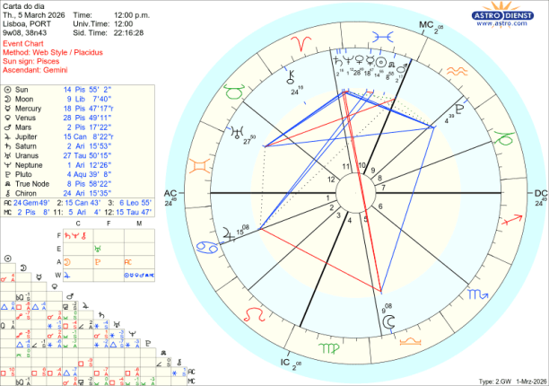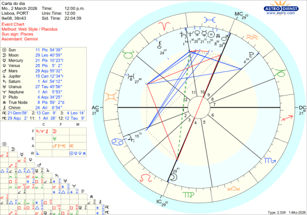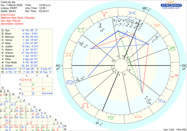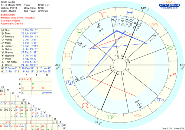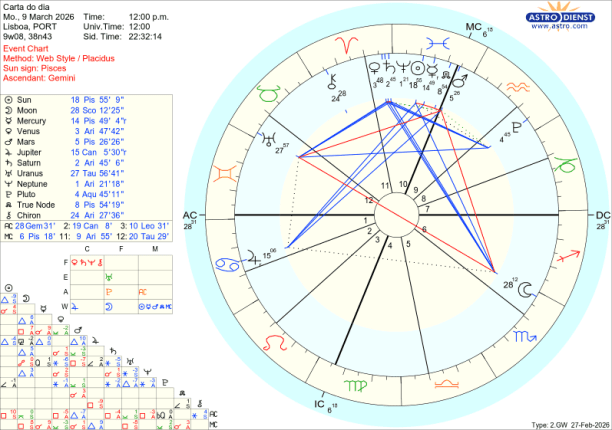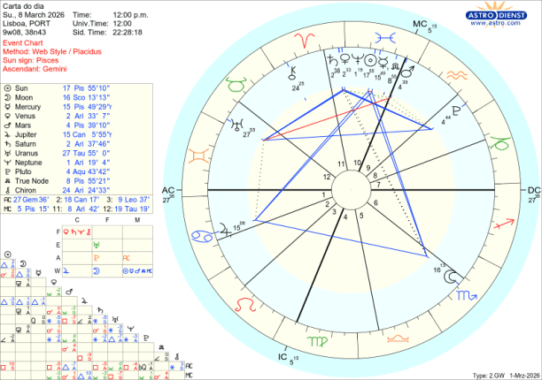 Assim, há que ver como um todo o período que vai desde o eclipse de 17 de Fevereiro e da conjunção Saturno Neptuno a 20 de Fevereiro ate ao quarto crescente de 23 de Maio, tempo que contem vários ” semáforos ” do movimento evolutivo. Para já, nesta primeira semana de Março, temos segunda feira uma oposição da Lua em Leão a Marte no ultimo grau de Aquário ainda em quadratura a Urano o que se traduz no prolongamento das guerras em curso e a manifestações públicas. Logo de seguida na mesma segunda feira dia 2, Marte entra em Peixes em sesquiquadrado a Júpiter em Caranguejo e a força ideológica, nacionalista, religiosa é amplificado em tensões ou conflito de difícil resolução. Marte em Peixes vai em frente porque acredita, mesmo que não saiba o caminho e assim serão “conduzidos” muitas das agressões em curso. Como Mercúrio também está em Peixes mas retrógrado, o potencial de fantasia, noticias falsas, informações ou declarações altamente ideológicas é imenso e o facto de estar em semi-quadratura a Plutão dias 4 e 5 e 6 produz uma sensação de ameaça, de perigo, de discursos ditatoriais, opiniões aguerridas que perturbam e turvam a compreensão dos factos ou eventos. Na sexta dia 6 é Venus que entra em Carneiro e passa a estar sob a influência de Marte, tal como Saturno, Neptuno Quiron – a ferida e Eris o caos, todos nesse signo. De dia 6 a dia 8 Vénus faz conjunção a Saturno e a Neptuno, num confronto do desejo com os limites da realidade, num limite do impulso por travões estruturais, politicos. É também mau para gastos… e por isso para as economias.
