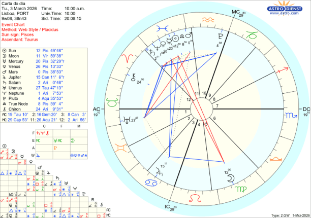 O impacto do eclipse da Lua de dia 3 antecipou-se para o líder iraniano Al Khameini … o seu Ascendente natal era exactamente a 12 graus de Virgem, grau onde ocorre o eclipse na terça feira. Israel atacou na quadratura de Marte a Urano em oposição e quadratura ao seu Marte natal e Trump cujo Marte tem o mesmo posicionamento que o Marte de Israel a 27 graus de Leão, recebeu influência idêntica e deu unilateralmente ordens para atacar sem consultar as câmaras. A 29 graus de Leão está o Ascendente do Irão e o mata e esfola de Netanyahu e de Trump abateram-se sobre o Irão: astronomicamente não podia bater mais certo… Mas se era uma mudança de regime que pretendiam, vai ser preciso esperar. O Ayhatolla pode ter sido morto entre a quadratura e o eclipse no Ascendente mas Saturno só vai chegar aos 11 graus de Carneiro, grau onde está o Sol da republica islâmica, na segunda metade de Maio e dificilmente antes disso haverá outro regime. E até lá????