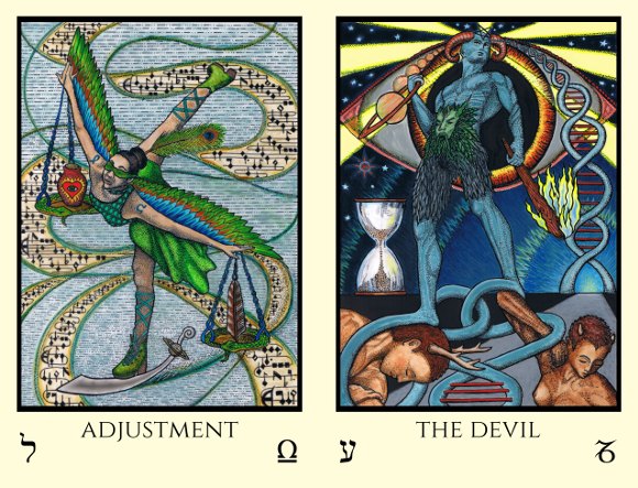 Primeiro temos a Justiça / Ajustamento, a pedir que sejamos capazes de escolher com a imparcialidade necessária os caminhos por onde teremos de seguir, em função daqueles por onde já passámos. Há aqui uma alusão ao livre-arbítrio, encarado como a maior responsabilidade de cada um para consigo e para com os outros. Cada escolha que fazemos, cada decisão que tomamos, deve partir de um esforço de análise das circunstâncias em questão, tentando vê-las desapaixonadamente e não desprezando umas em favor de outras. O objectivo é procurar o equilíbrio e a paz interior, pondo a razão ao comando.