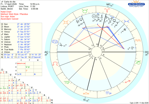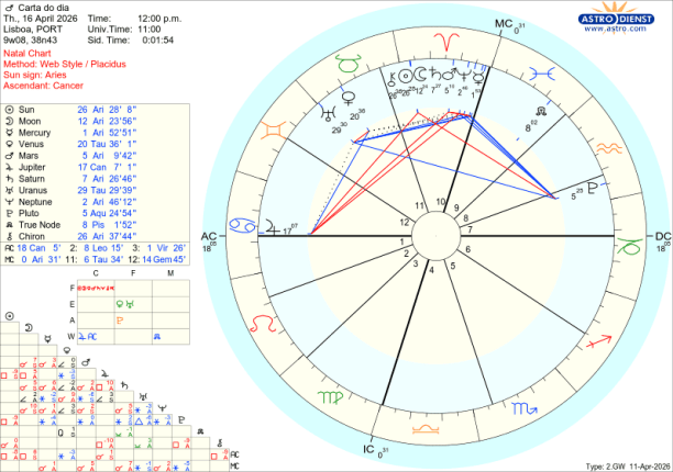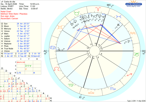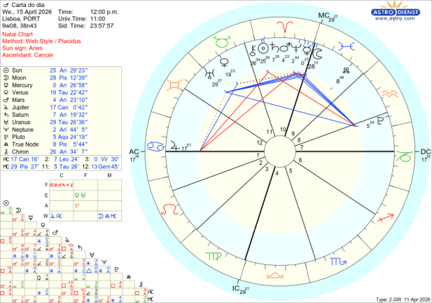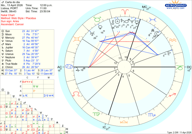Em resumo, a tensão em que estamos desde dia 9 está em escalada esta semana. Segunda e terça ainda parece tudo pouco claro, de quarta a sexta a dinâmica é potentíssima e a partir de domingo já estamos a ver os custos de tudo o que aconteceu. No domingo 19, Marte vai estar em conjunção exacta a Saturno num golpe radical a tudo que pode ser simbolizado como ordem vigente. O facto de na segunda 20 o Sol entrar em Touro e Marte e Mercúrio ficarem conjuntos em Carneiro pode representar o foco sair do bélico para o económico apesar de a comunicação e discussão continuar a ser sobre vitórias ou conquistas da semana, com muitos ataques verbais.. A importância do económico já está num crescendo mas também esta semana a partir de quarta feira fica acentuada com a aproximação de Vénus a Urano em Touro, que farão conjunção exacta dia 23 antes de entrarem ambos em Gémeos. A imprevisibilidade vai ser a regra: nas relações pessoais ou económicas. O que eram valores seguros vão deixar de o ser. Pode o dólar deixar de ser a moeda de todas as transações, pode haver surpresas na vida dos bancos, pode a economia digital dar um salto tecnológico… pode tudo o que for sinal de novos valores em circulação globalmente – pelo trígono a Plutão em Aquário – a partir do fim de Abril e nos próximos 7 anos enquanto Urano estiver em Gémeos.
