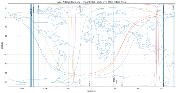 As datas mais relevantes já anunciadas para os principais protagonistas mundanos são as seguintes: EUA, o ingresso de Marte em Carneiro traz, até ao fim do mês de Abril, uma grande intensidade de conflitos internos, a anotar desde já em tornos dos dias 13, 17, 21, 24 e 27. Na Russia, Marte agrava as tensões em particular por volta dos dias 13, 14, 25 e 27. Nos Ceus da República Islâmica do Irão, a tensão é ainda maior a partir do dia 22 e até finais de Maio e em Israel do final de Abril a meados de Maio, Marte em quadratura à Lua cansa da guerra. No ceu de Trump, Urano faz quadratura aos ascendente descendente na ultima semana de Abril.