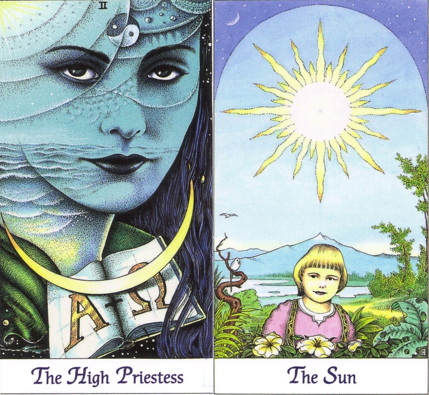 É natural que o lado luminoso do Sol tenda a sobrepor-se à influência lunar da Sacerdotisa. Será importante que reservemos tempo para estar sós, espaço para nos encontrarmos com o que trazemos dentro sem pressas e sem pressões externas. A Sacerdotisa aparece aqui como elemento de ponderação para contrabalançar os possíveis excessos de optimismo do Sol, que emana tanta luz que faz desaparecer da nossa vista todos os outros astros. Preservemos então as nossas noites, ou os nossos tempos pessoais, para parar e deixar fluir aquilo que só nos vem do silêncio e da tranquilidade. Daí nascerá mais verdade e mais autenticidade, que depois poderemos trazer à luz e aos outros.