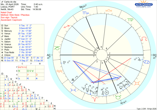 Na segunda feira dia 20, Marte está ainda conjunto a Saturno em Carneiro, o que, apesar de ser um bloqueio- ou um cessar fogo- não deixa de ser um travão frágil porque Marte está em casa e Saturno está fragilizado neste signo. O sextil que fazem à Lua em Gémeos, que por seu lado está trigono a Plutão, permite perceber que há vários ângulos e que todos querem vingar. A Lua faz também quadratura aos Nódulos Lunares o que simboliza a tensão de termos as emoções num sitio e o compasso de navegação noutro, mais complicado ainda por tudo se passar em signos duplos, Gémeos e Peixes. É também segue da feira que o Sol, a energia vital, o foco de luz entra em Touro, signo fixo, de Terra onde a segurança material, os recursos naturais, a economia global e as nossas poupanças pessoais são o valor a defender. Ora, desde segunda, até domingo este foco na segurança e valores materiais avança para uma tensão máxima com as forças de transformação em plena actividade global, numa quadratura entre o Sol em Touro e Plutão em Aquário. Trata-se da primeira quadratura do Sol a Plutão desde que lhe fez conjunção em janeiro deste ano, Foi em Janeiro que o governo iraniano massacrou milhares de civis que protestavam e que os EUA ameaçaram intervir militarmente e começaram a elaborar e constituir um plano de intervenção militar contra Teerão, maior ainda do que para a invasão do Iraque em 2003. Temos assim esta semana o confronto antevisto desde janeiro.