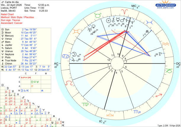 Na terça dia 21, Marte já não está preso nos anéis de Saturno, avança pelo Carneiro conjunto a Mercúrio com declarações de intenção e confronto e a Lua pela tarde entra em Caranguejo: torna-se mais fácil o exercício da vontade ou esforço bélico e é para a segurança doméstica, nacional que todos olhamos com outro olho no que se sente já como efervescência económica. Vénus que rege o Touro onde o Sol se encontra aproxima-se de uma conjunção exacta a Urano na quinta feira, mas tecnicamente toda a semana já se vive a ameaça da imprevisibilidade económica que pode afectar investimentos, bolsas e moedas.