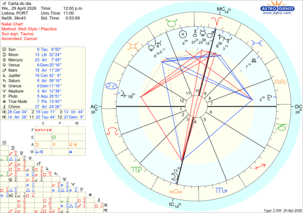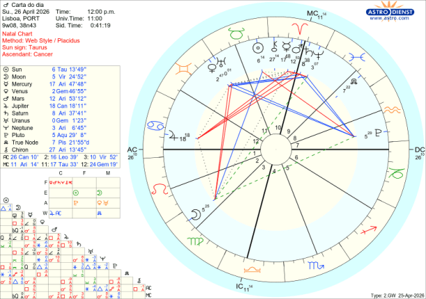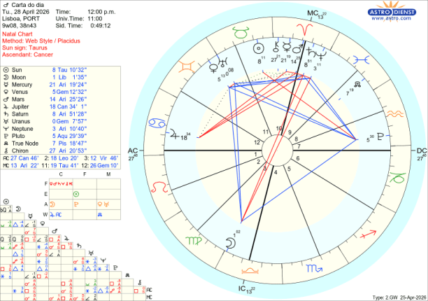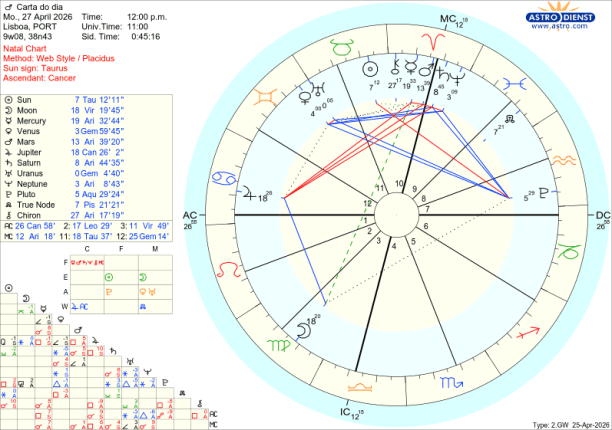 O sentido crítico está afinado na segunda feira com a Lua na fase gibosa, crescente, no signo da Virgem. O olhar apurado, a análise, o sentido do detalhe, os cálculos de probabilidades são importantes neste dia para avaliar o que se está a desenvolver para eclodir na Lua Cheia. O Sol em Touro sextil ao Nódulo Norte e Vénus seu regente em Gémeos são a aposta em valores seguros, sólidos, de futuro, em que foram analisadas as várias possibilidades. Mas a Lua faz também um quincúncio a Plutão em Aquário que mostra quão grande é a pressão para resolver crises sociais, no mundo, nas finanças. Um sesquiquadrado da Lua a Mercúrio em Carneiro é outro sinal de bloqueios de comunicação. De segunda a domingo Marte em Carneiro avança para uma quadratura exacta a Júpiter em Caranguejo. Este aspecto dá a energia, a “pica”, para começar novos projectos desafiantes e arriscar tudo em prol de grandes sucessos. Por isso, este é outro apontador de que algo está em processo de ebulição com revelação na Lua Cheia e desenlace de seguida. No entanto, se