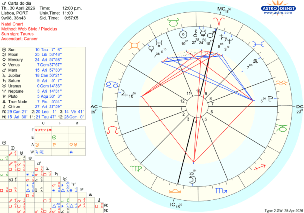 Na terça e quarta feira, com a Lua em Balança, signo cardinal, procuramos o diálogo, a concertação, a diplomacia. Queremos evitar discutir mas não é possível. Vamos ter de nos confrontar com alguém ou alguma coisa porque a Lua começa por fazer oposição a Saturno o que nos aponta os limites e responsabilidades e de seguida faz oposição exacta a Marte em Carneiro nos 14 graus o que traz o choque entra a nacionalidade e a impulsividade. Traz também dúvidas porque Vénus que rege a Balança está em Gémeos em quadratura aos Nódulos e qualquer escolha ou opção será de grandes consequências. São dias em que a reflexão pode dar pontos.
