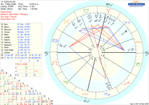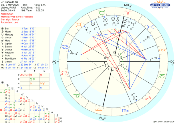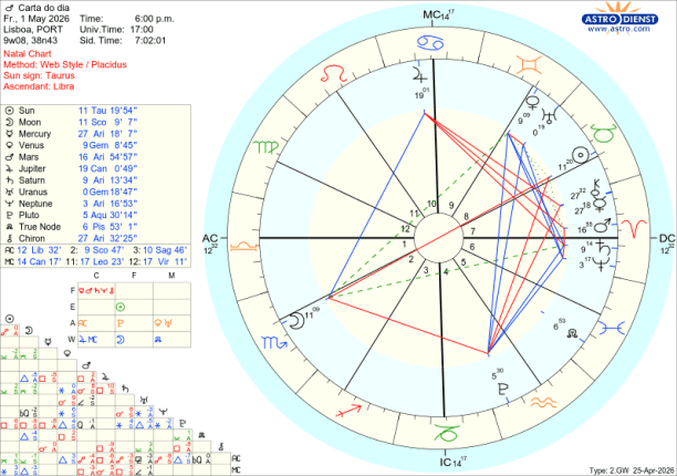 Quinta feira a Lua ainda em Balança opõe-se a Mercúrio e a Quíron em Carneiro: queremos a paz mas há muita agressividade e feridas por sarar. A possibilidade de equilíbrio dura pouco. Pela tarde a Lua entra em Escorpião a caminho da oposição ao Sol na Lua cheia de sexta feira. As respostas emocionais começam a ferver com a quadratura da Lua a Plutão. Os sentimentos são fortes nas relações com o colectivo, nas finanças, no controlo . A escalada culmina sexta no grau 11 do Escorpião versus o grau 11 do Touro, na Lua Cheia no eixo dos recursos materiais versus quem tem o poder sobre eles. É difícil esconder o que quer que seja com uma Lua Cheia em Escorpião no dia 1 de Maio. O mês começa com um estrondo. Tudo o que estava contido, escondido, calado tem de irromper e materializar por via do Sol em Touro. Um trígono da Lua a Júpiter em Caranguejo mostra que defender o que é nosso, família, casa, tribo nação é o maior dos estímulos principalmente porque em simultâneo Mercurio e Quiron estão em conjunção exacta em Carneiro e Vénus em sextil exacto a Saturno: sabemos onde está a doer, o que tem de ser sarado e quais as melhores opções para garantir o controlo da situação. No sábado dia 2 pelo final do dia, mais surpresas com a Lua a entrar em Sagitário e a fazer oposição a Urano em Gémeos. Em Sagitário, domingo e segunda a Lua faz trígonos aos planetas em Carneiro: vamos fazer aquilo em que acreditamos, com o sentido prático que Mercúrio recém entrado em Touro garante, já que o que se quer são resultados palpáveis.